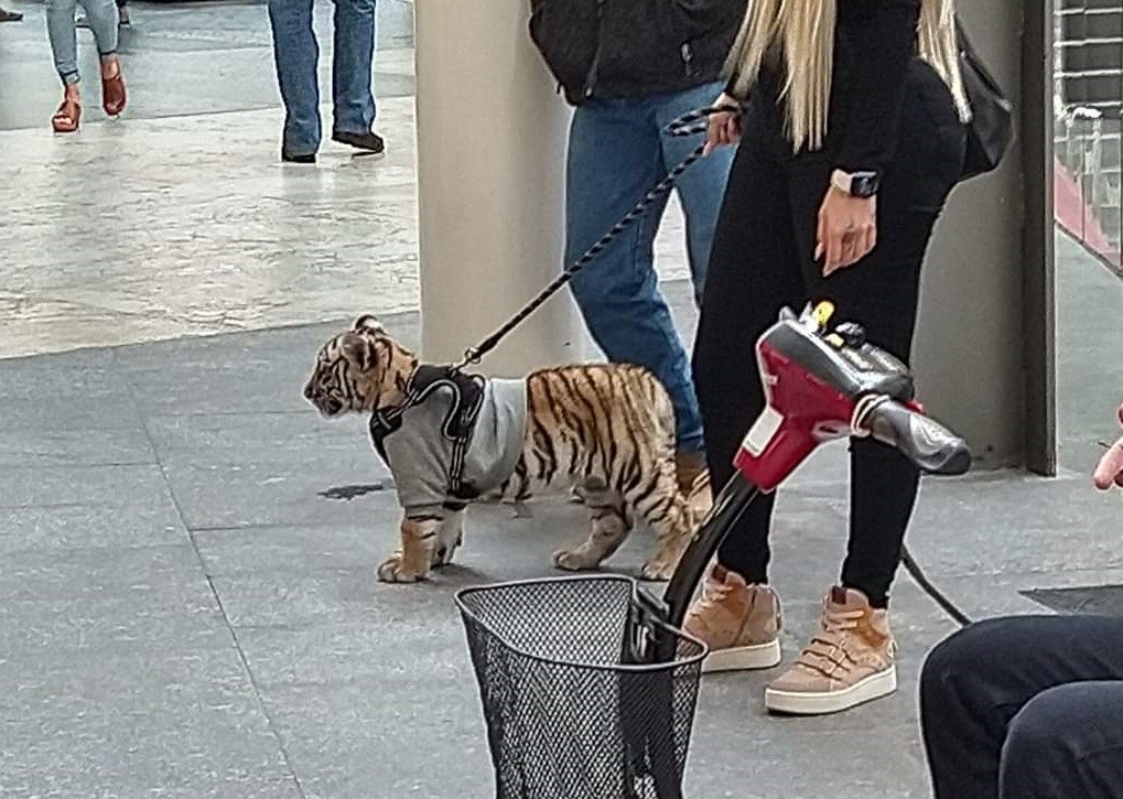 墨西哥首都墨西哥城周一(7日)出現引人注目的景象,一名穿著入時的金髮女子在安塔拉(Antara)購物中心逛街時,遛寵物的非貓非狗,竟然是一隻孟加拉幼虎。雖然牽繩看起來非常牢固,也有許多民眾好奇圍觀老虎,仍讓不少人感到害怕和憤怒。