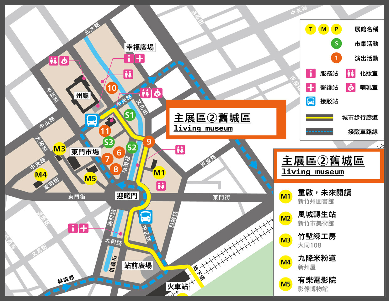 新竹市美術館則在展覽期間將擔任旅遊服務站「風城轉生站」,展出新竹的「人生跑馬燈」,訴說新竹市東西南北門等各區的舊城故事,一次讀懂新竹老城歷史;最大亮點是外牆將有以「光動域」為主題的光雕投影展,讓95年古蹟搖身變成夜間最潮的光影打卡點。