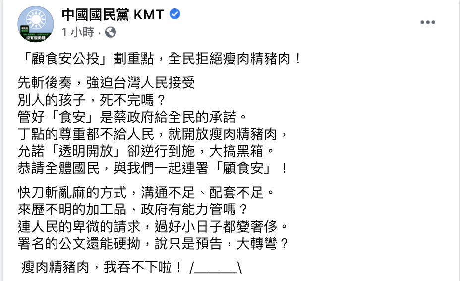 國民黨臉書9日晚間發文呼籲民眾連署拒絕瘦肉精美豬的食安公投,文中竟有藏頭詩,「先別管丁允恭 快來連署」,諷刺總統府前發言人丁允恭的緋聞事件。