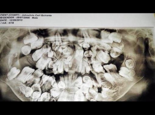 菲律賓男孩卡爾(Johncris Carl Quirante)2歲時被發現,嘴巴裡竟然有50顆牙齒,但因為家中沒有能力讓他治療,幾年後再到牙科檢查時,驚覺這些牙齒竟以倍速成長,來到了300顆,比普通人多出9到15倍。