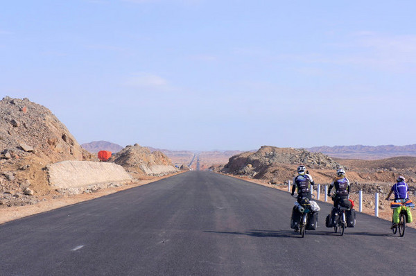 整條公路又長又直,就像沒有盡頭一樣直達天際,這樣開闊的視野實在讓人震撼。走了大半路程才終於碰上所謂還未完成的路段,有些是還沒鋪設完柏油路面,而有些還有橋梁還未銜接起來。但至少避開後可以再走上安全為開放的路段,就不用再大車身邊玩命了。