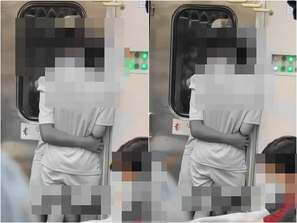 該名男網友在臉書社團「爆廢公社」以「褲子裡的小松鼠」為標題,PO出兩段影片。影片顯示,一名戴著口罩的男學生擁抱著女同學,靠在台鐵區間車的分隔車門上,車廂內也坐滿不少通勤族。