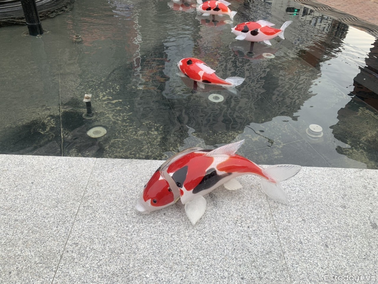 ▲都城隍廟廣場龍鯉池的「玻璃鯉魚」12日上午被發現從背上裂成2半。(圖/記者陳凱力翻攝,下同)