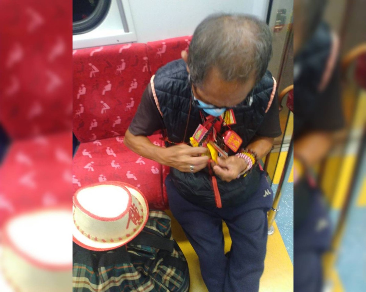 這名老阿公身上戴滿符咒跟佛珠,讓旁人不敢靠近,還大剌剌的躺在椅子上睡起覺來,等到列車長要查票時,「到底是放在哪一張裡面」,不時翻護身符,一旁乘客暗笑,認為阿公恐怕被好兄弟戲弄過吧,要不然全身滿滿都是符咒,就連列車長也納悶。