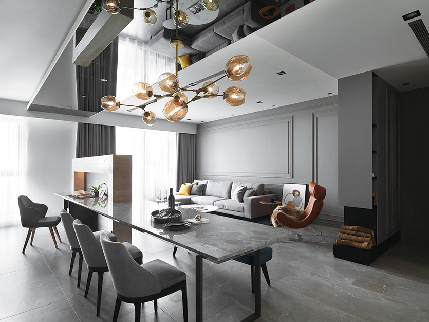 以奢華氣息的公領域和感受生活溫度的私領域,令兩者並存,且以現代風格傢俱及輕美式裝修的基底佈局,試圖創造揮別以往的衝突美感。