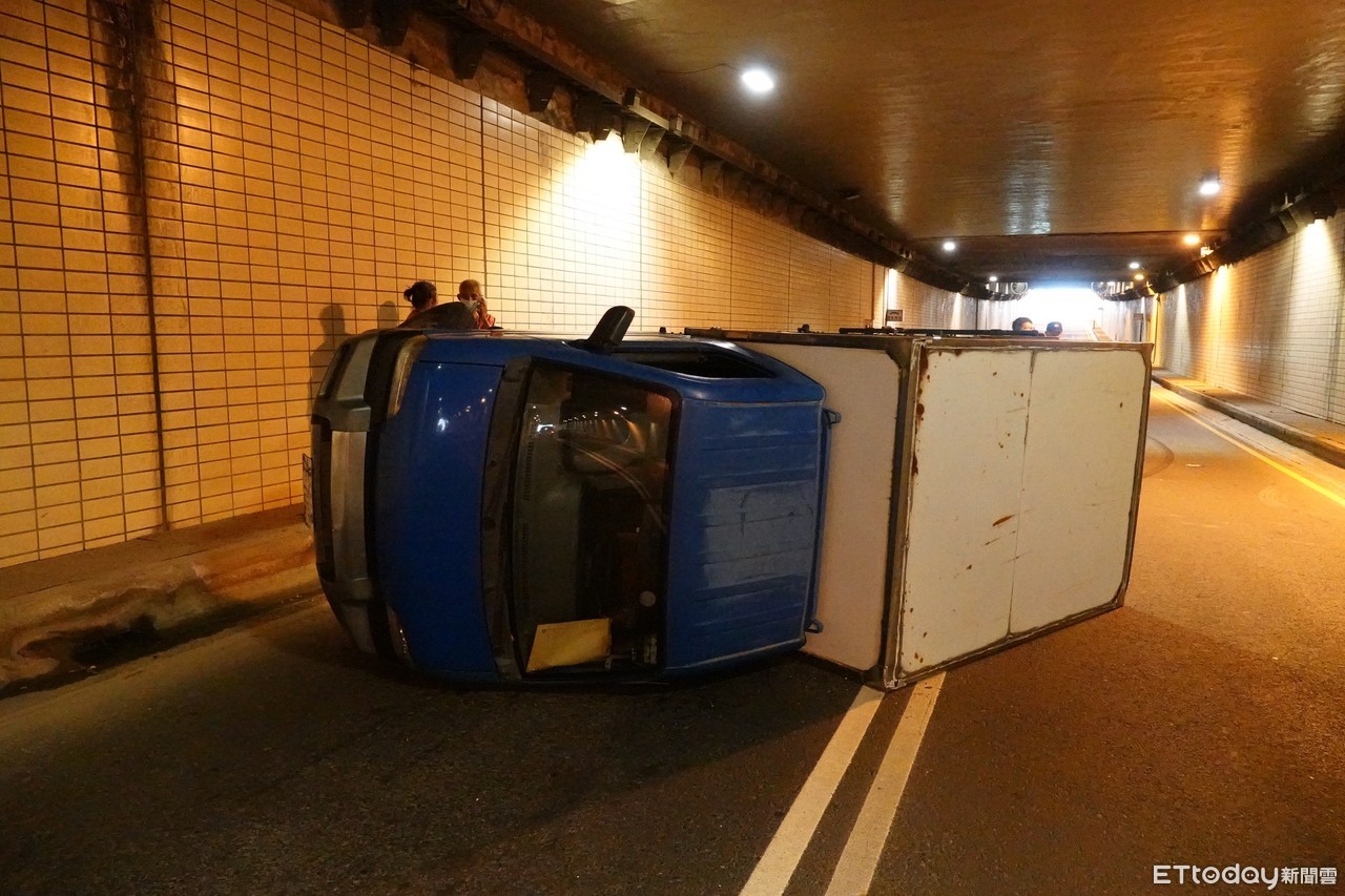 ▲小貨車通過地下道時,突然翻覆在中線車道。(圖/記者黃子倩翻攝)