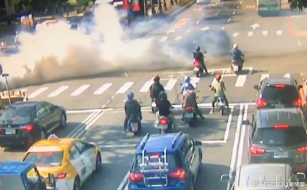 路口監視器拍下,一輛貨運車從原福街左轉駛入中華路,但在經過十字路口時,車後方卻突然排出大量濃濃白煙,恍若烏賊過境,大量的煙塵瞬間遮蔽用路人視線,一度完全無法看清前方路況;而後方轎車被噴了一臉白煙後,也急忙減速,確認安全無虞才緩緩從煙霧中駛出。而當時路口還有不少騎士停等紅燈,見到貨車挾著白煙駛過後,當場傻眼,忍不住轉頭看看到底發生了什麼事。