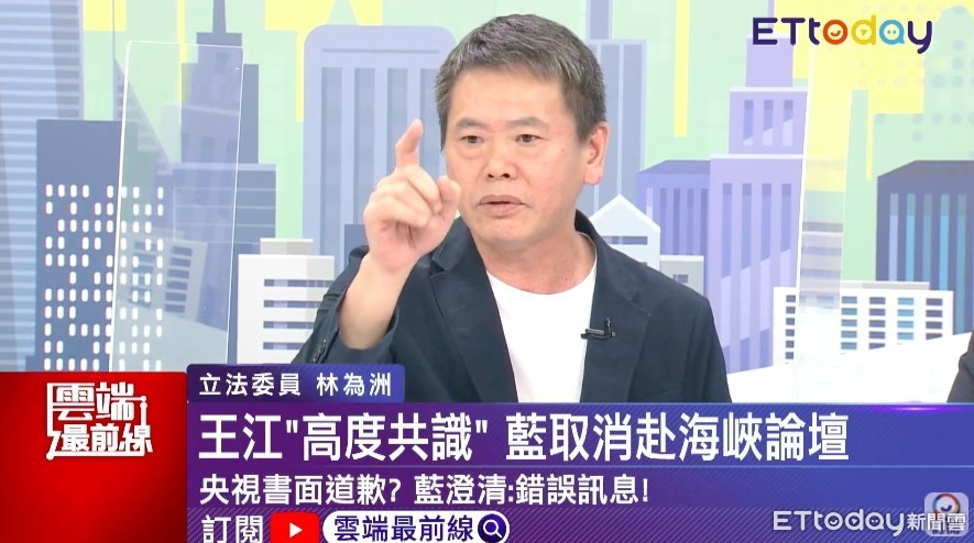王金平原訂代表國民黨赴廈門參加海峽論壇,但央視日前一席「求和說」引發黨內強烈不滿;國民黨並於14日下午召開記者會,宣佈不派員出席海峽論壇。回顧決策過程,林為洲指出,自己當時有提醒黨主席江啟臣,如今被官方稱「求和」,甚至被網友講「要飯的」,「我們是在當豬頭嗎?還要去嗎?」後來江啟臣就做了決定。