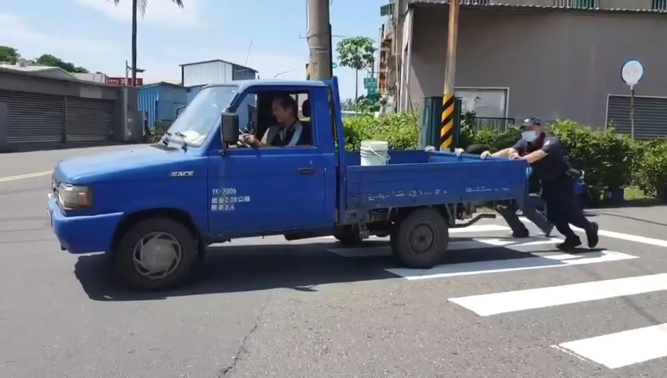 根據了解,當時警方看到貨車突然卡在路中央動彈不得,上前關心時,駕駛向警方表示:「也不知道什麼原因,可能是電瓶沒電了!」,由於貨車突然熄火的原因可能和電瓶老舊有關,一時半刻也無法解決,因此副所長當機立斷,請貨車駕駛上車控制方向盤,副所長自己則和乘客一起在後面推車,先將貨車推到路邊,再聯絡附近車行前來修理。