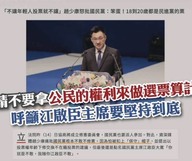 民進黨青年部指出,立法院將成立修憲委員會,媒體人認為國民黨因為怕被扣上「保守」帽子,不敢不參與修憲,並提出以投票權年齡下修交換不在籍投票的建議,甚至還表示「不讓年輕人投票就不讓年輕人投票」。