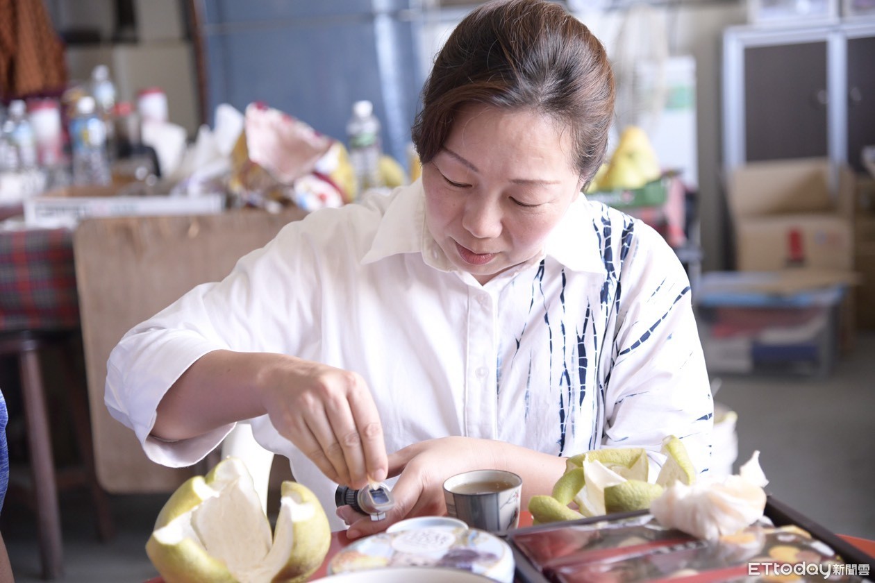 ▲徐榛蔚現場品嚐文旦柚,同時機器實測,更有高達17.5度的甜密滋味。