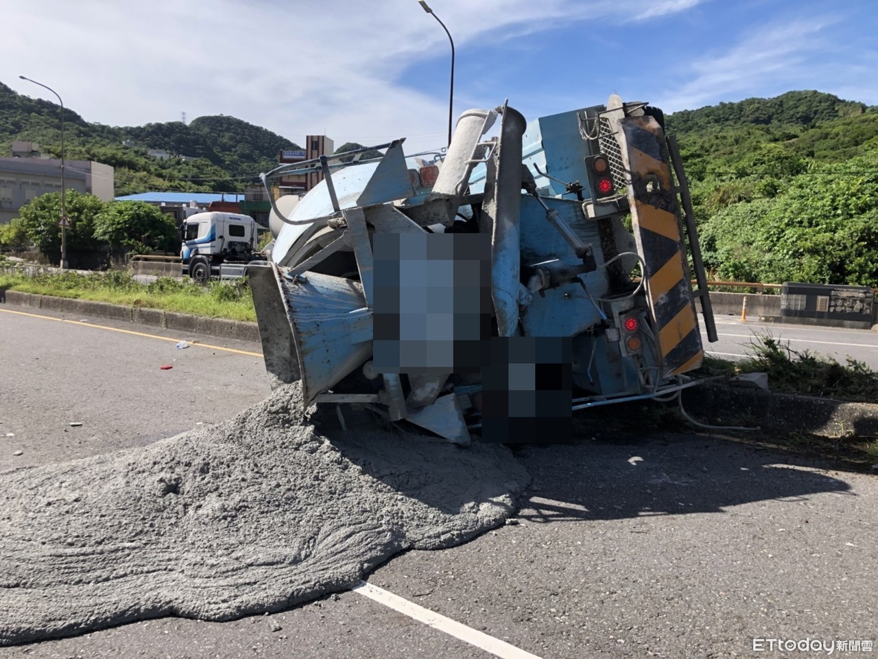 ▲台2線73.5k瑞濱路口往宜蘭方向17日上午一輛水泥預拌車翻覆。(圖/記者郭世賢翻攝,下同)