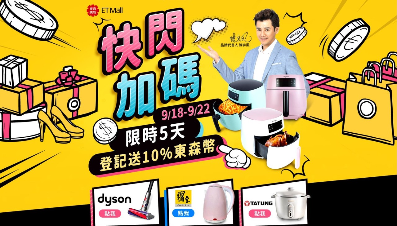 振興券花完了、99購物節也過了,卻還沒入手想買的家電嗎?東森購物為了回饋會員朋友,針對指定小家電商品,將於9/18~9/22推限時5天快閃雙重優惠,家電館小家電最便宜只要99元,下單完成登記再送10%東森幣;至9月底前,購買家電商品不限金額,會員完成登記就抽象印電子鍋。