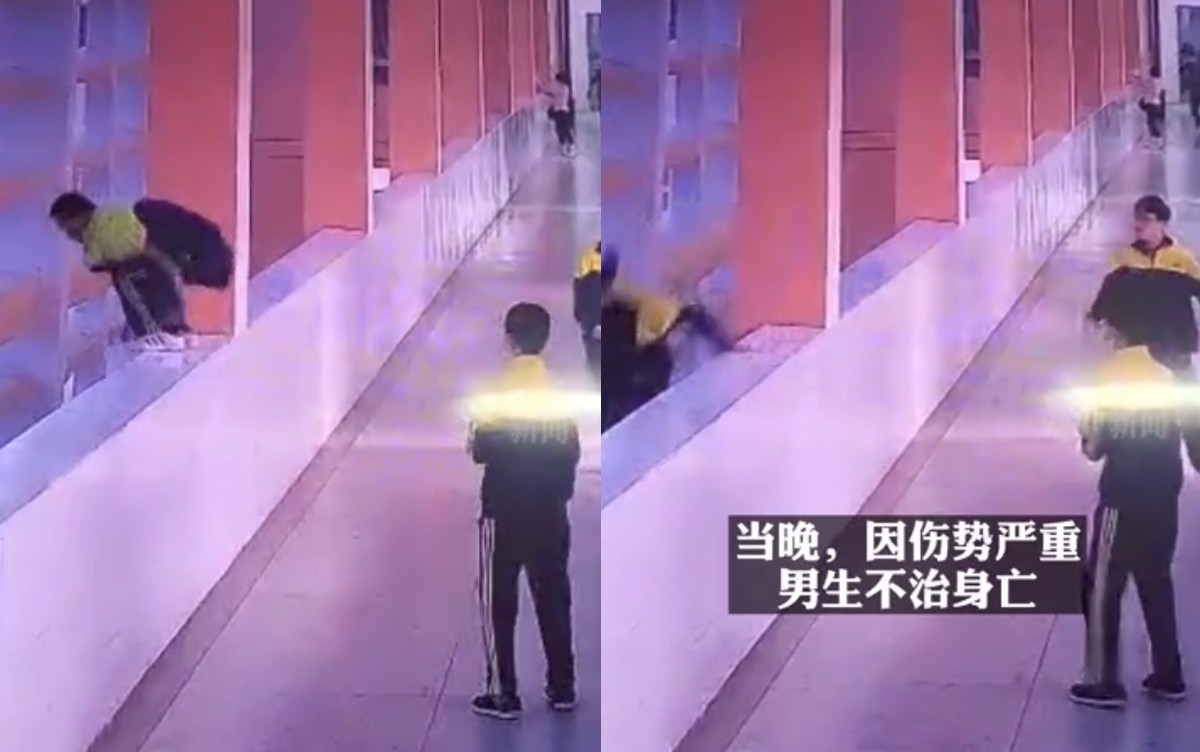 沒想到,少年獨自站在原地幾分鐘後,突然之間一個翻身,就越過了學校走廊的圍欄,雖然有幾名同學們趕過去想要阻止,但還來不及反應,他已經頭也不回地就從5樓跳下。