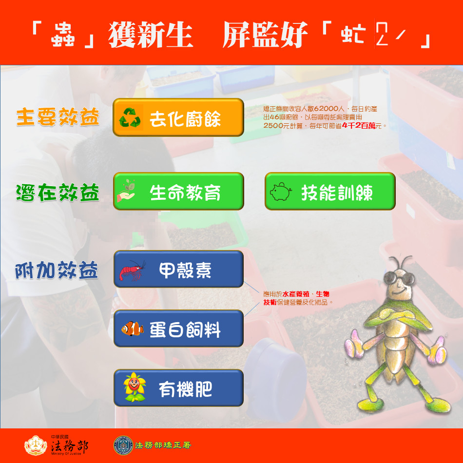 屏東監獄委請學界提供技術指導及研發,利用黑水虻幼蟲在自然界以廚餘等腐爛有機物為食物,大量且有效率地處理廚餘;另從養殖過程中,也讓收容人體會生命教育之意義,累積養殖經驗及技能,出監後順利復歸社會、重獲新生。