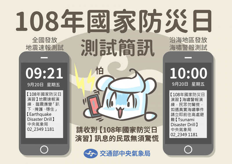 明天將屆921大地震21周年,為了提升各地災防應變能力,內政部將在明日上午9點21分發送「地震模擬演習簡訊」,上午10點至10點10分則將運用防空警報系統,發布海嘯警報釋放,提醒國人若收到簡訊切勿驚慌,一同演練抗震保命3步驟「趴下、掩護、穩住」,配合模擬演練因應措施。