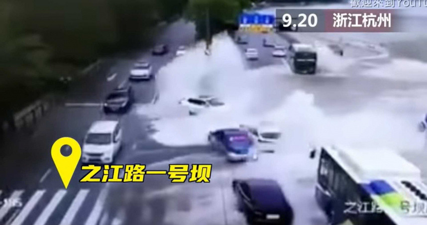 綜合陸媒報導,事發地點是在之江路一號壩西(九溪一號壩附近),下午3時53分許,潮水突然湧上路面,將十多輛行進間的轎車沖到失控,最嚴重的甚至被沖了好幾公尺遠。其中一輛轎車壓倒路邊護欄,兩輛公車被逼得停駛,路面一秒變泳池;杭州交警表示,共有7輛轎車毀損嚴重,但幸好無人傷亡。