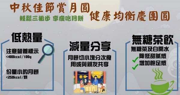 二、 減量與分享:若食用份量較大的月餅,容易因吃太多月餅而產生腹脹、消化不良等症狀,可以將月餅切小塊分次食用或與親朋好友共享,分散熱量攝取,一起享健康。三、 搭配白開水或無糖茶飲:吃月餅時,建議以無糖茶飲或白開水取代含糖飲料,可以降低月餅的甜膩感及增加飽足感,除了減少月餅食用分量,也可以避免飲料帶來額外的熱量。