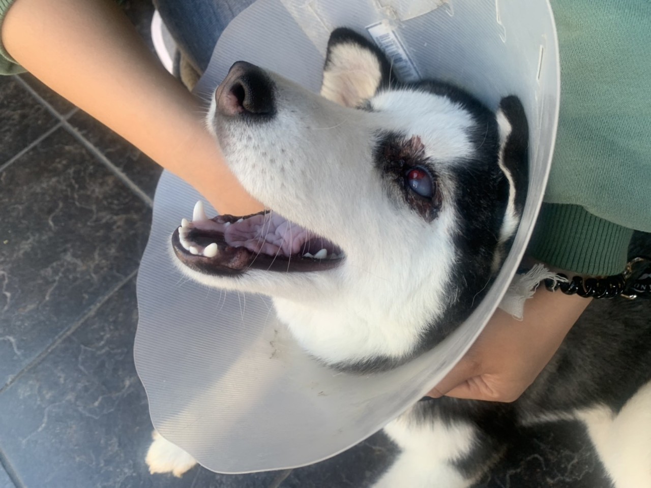 ▲哈士奇經送醫仍舊不回眼睛,只好進行眼球摘除術,確定牠左眼終身失明。(圖/記者郭世賢翻攝)