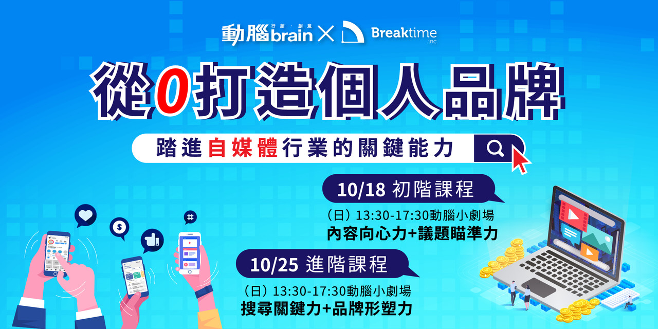 每次的創作就是在打造個人品牌、建立知名度。如何在眾多同性質的創作者中脫穎而出?這些關鍵能力將由知名部落客與網紅擔任講師現身分享,讓你學會踏進自媒體行業的關鍵能力,從0打造個人品牌,重新檢視你的內容經營策略!