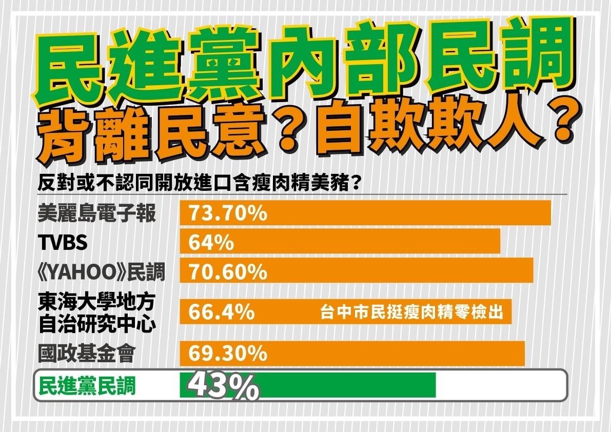 國民黨抨擊,蔡英文政府不但會買廣告,更會造假消息跟假民調,民進黨宣稱內部民調顯示開放美豬牛的正反意見皆呈現43%,但是近期各家媒體做出的民調,反對開放的比例都達到6至7成以上,民進黨的民調數據明顯悖離現實,是不是刻意操作假民調誤導人民?