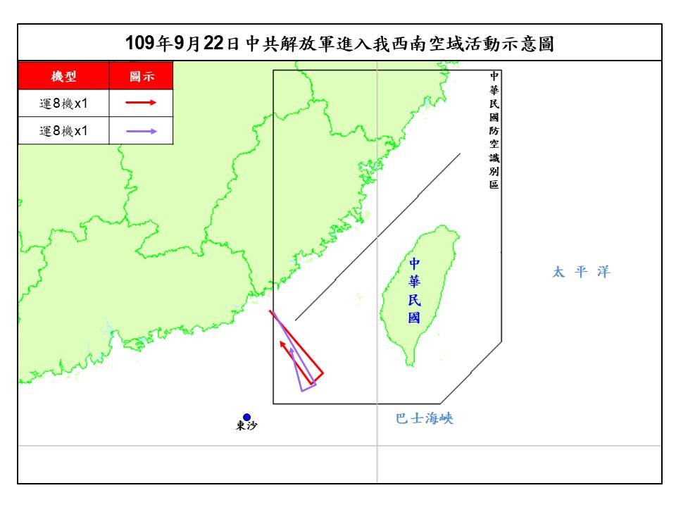 國防部22日晚間證實,共軍今派遣2架運8反潛機侵擾我西南防空識別區,而國軍派遣空中巡邏及緊急起飛等兵力應對,並以廣播驅離及防空飛彈追監。