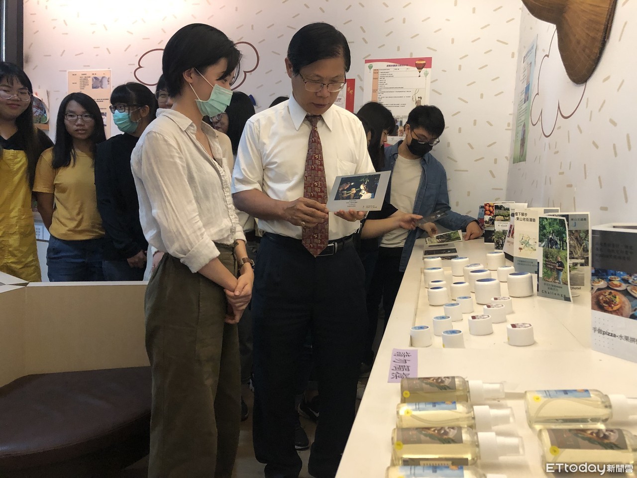 ▲中華醫大設計思考與實作課程舉辦「鄉村ONE PIECE」聯合成果展,校長曾信超(前右一)參觀學生創作聆聽學生導覽解說。(圖/記者林悅翻攝,下同)