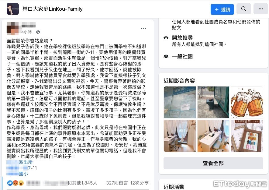 一名心痛的媽媽在臉書社團「林口大家庭LinKou-Family」貼文,指稱就讀小學三年級特教班的兒子,22日課後班下課後,被一名小四的學生威脅,半推半就到旁邊便利商店購買零食,還要他拿出晚餐費來買單,事後心生恐懼呆坐現場;媽媽趕到要接他回家時,發現舉止異常,細問下才知身障的兒子遭到霸凌。