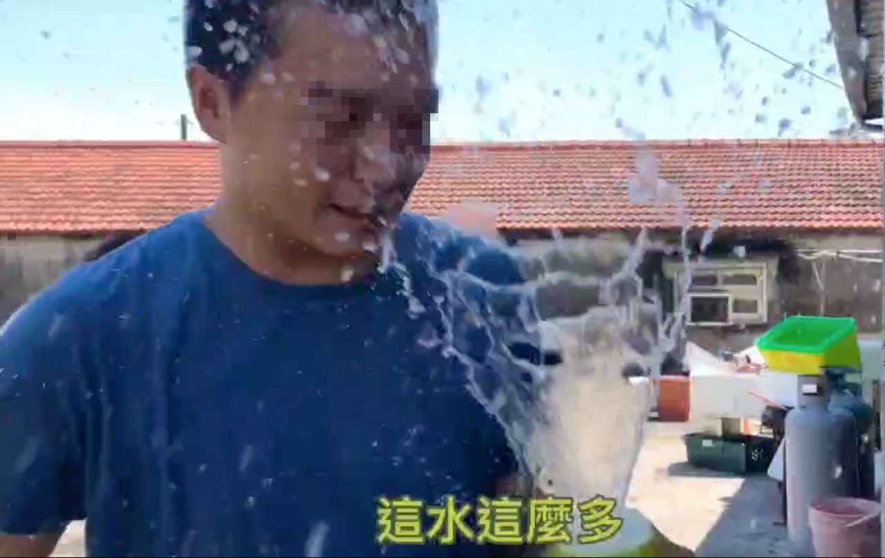 邊切還邊展示說「咱這麻豆出產的柚子吼,這水有夠多你看」,男子一剖開柚子馬上留出水柱,一旁還有人附喝「你看看,水這麼多」,最後水柱便湧泉,噴得男子滿臉都是,