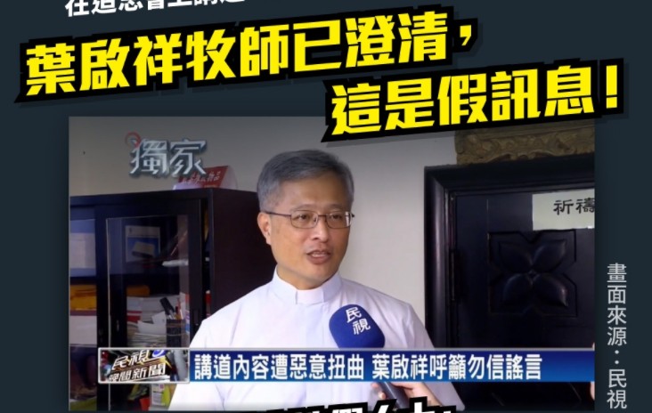 民進黨表示,該不實的網路謠言,稍早,當天主禮的葉啟祥牧師已出面澄清,表示他的話語遭到惡意解讀,這樣栽贓的行為,已帶給他很大的困擾,他呼籲大家不要誤信假訊息。
