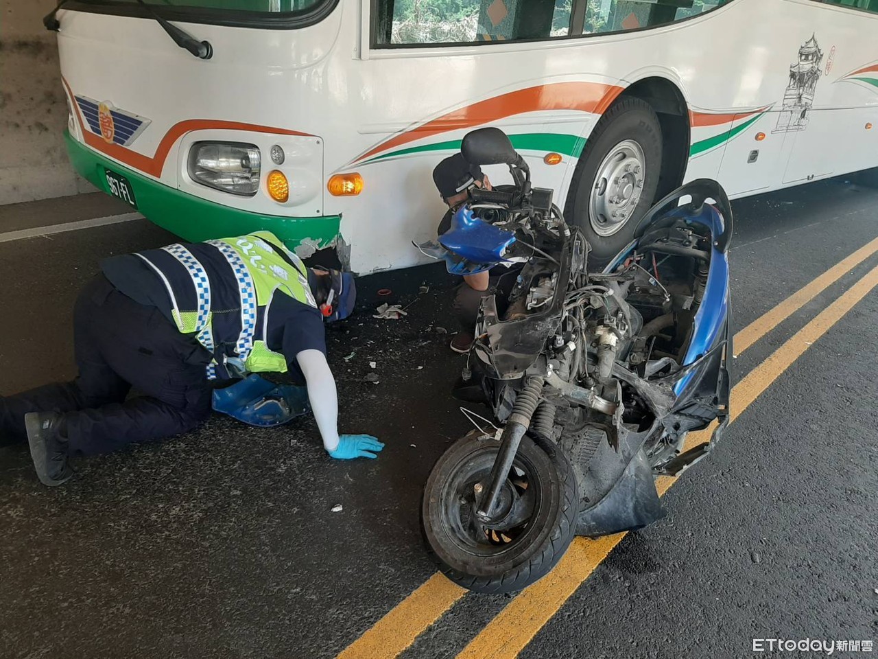 ▲騎士跨線撞公車頭破慘死,司機供稱:「他們在併騎聊天」。(圖/記者黃孟珍翻攝)