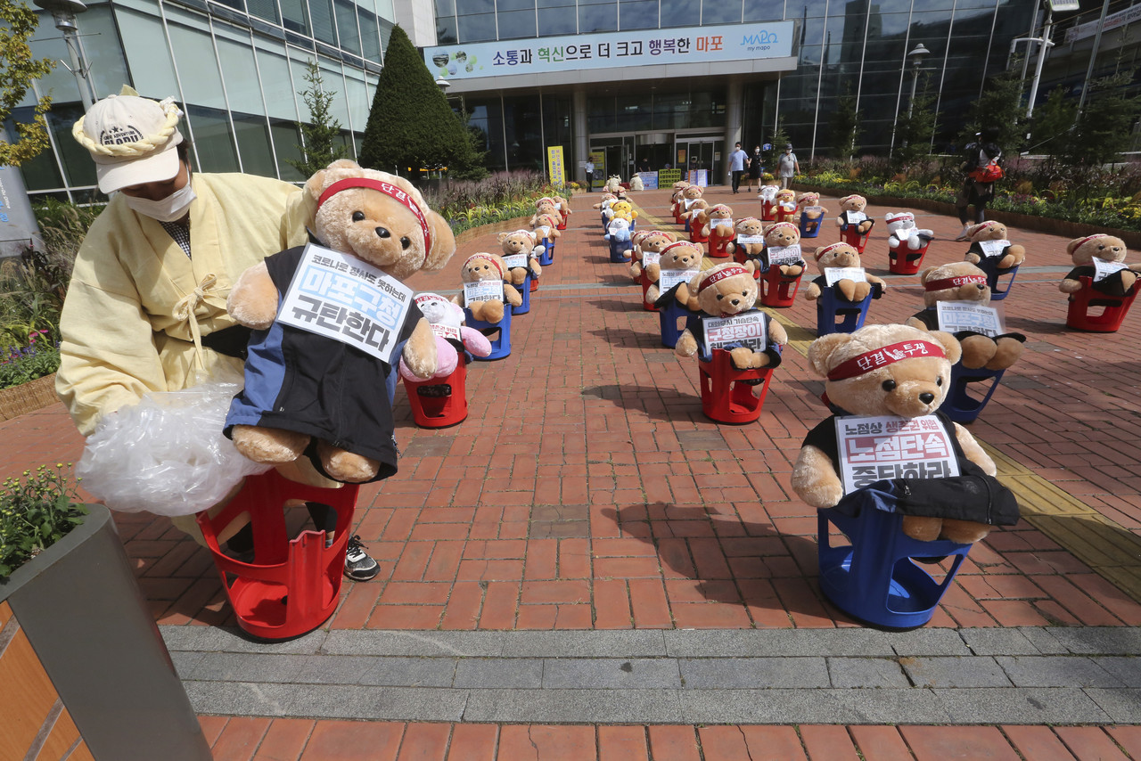 ▲攤販在首爾市麻浦區廳前擺放50隻熊娃娃,抗議區廳稽查非法攤車。(圖/達志影像/美聯社)
