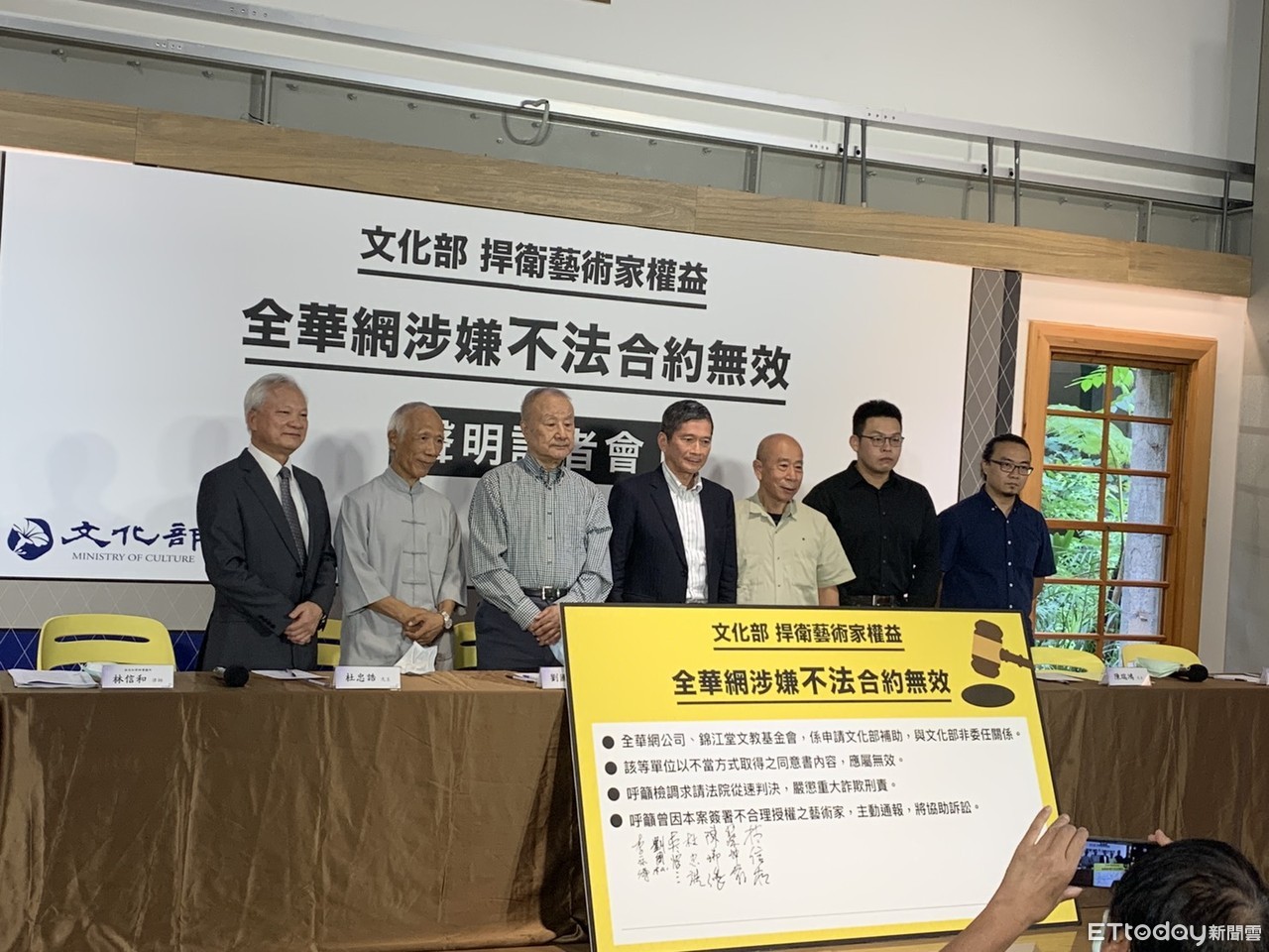 文化部今(24)日召開聲明記者會,邀請受害藝術家、義務律師團代表、藝文公協會及國藝會代表等共同出席,由文化部長李永得發表聲明,嚴正譴責全華網公司及錦江堂基金會負責人林株楠不法作為,重申其所騙取之藝術家同意書應屬無效,呼籲檢調求請法院從速判決,嚴懲林株楠重大的詐欺刑責。