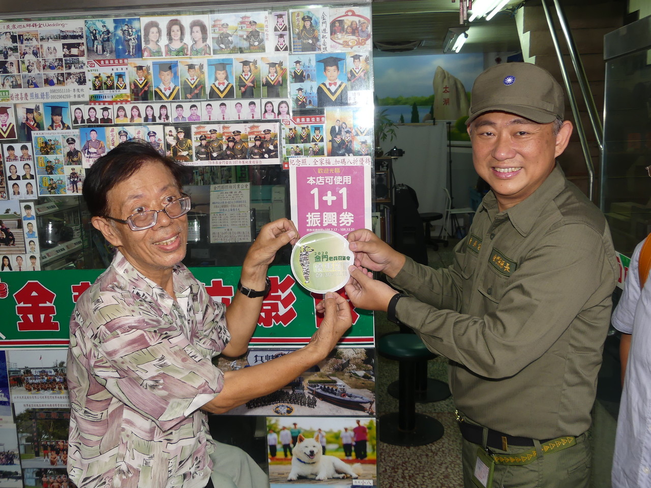 24日楊鎮浯縣長特別變裝成老兵,穿著草綠服到攝影社拍退伍時必拍的紀念照,在店家門口貼「優惠店家」標示、懸掛上活動旗幟,楊鎮浯表示,老兵返金除了回味當年的環境,當年的商家更是回憶軍旅生活酸甜苦辣不可或缺的一部分,因此本次活動特別鼓勵曾經做過阿兵哥生意的店家來共襄盛舉,提供消費優惠或專屬體驗遊程,一起歡迎老兵回來。