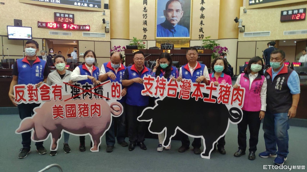 台南市議會第3屆第4次定期大會24日開幕,國民黨團特別準備兩隻大美豬看板,寫著支持台灣本土豬肉,書記長王家貞議員問黃偉哲市長支不支持本土豬?吃不吃萊克多巴胺豬?黃偉哲清楚表態,支持台灣本土豬,他個人不吃萊克多巴胺豬。
