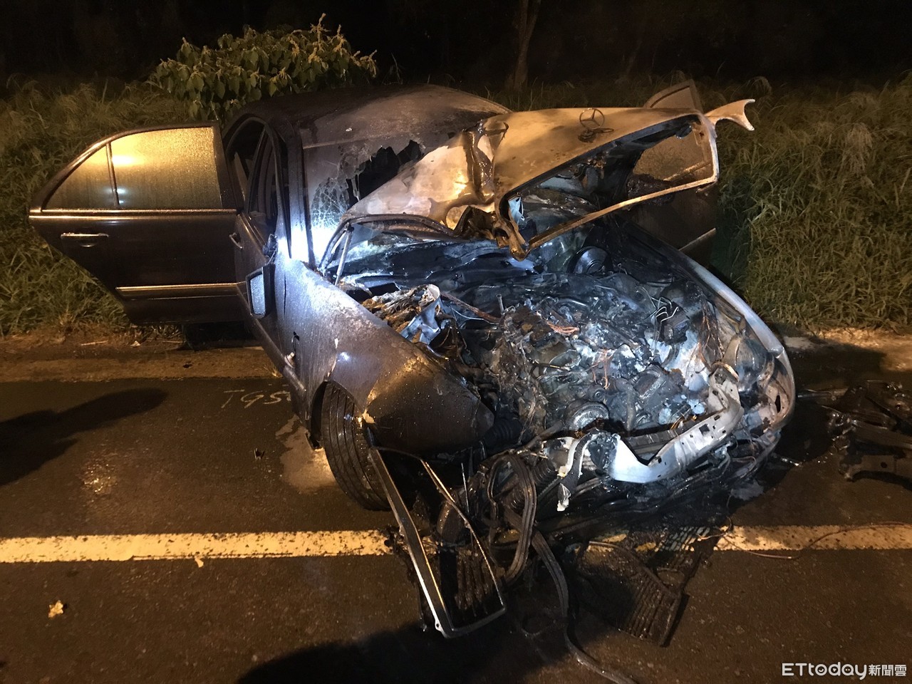 ▲黑色賓士車自撞後快速起火,林姓駕駛與孕婦乘客順利逃生。(圖/記者陳凱力翻攝,下同)