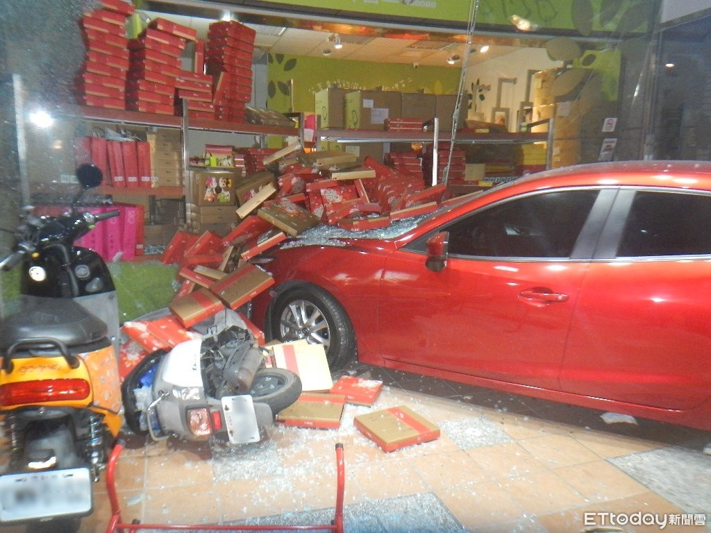 69歲吳姓婦人24日18時許,駕駛紅色自小客車載著一位朋友,沿鳳山區文平路由西向東直行,右轉文鳳路過彎時因疑似對車況及地形不熟,失控先開上騎樓撞到兩部機車,再撞進入糕餅店門口,造成店家大門玻璃破裂,櫥窗上的禮盒也被撞飛碎爛,全散落一地。