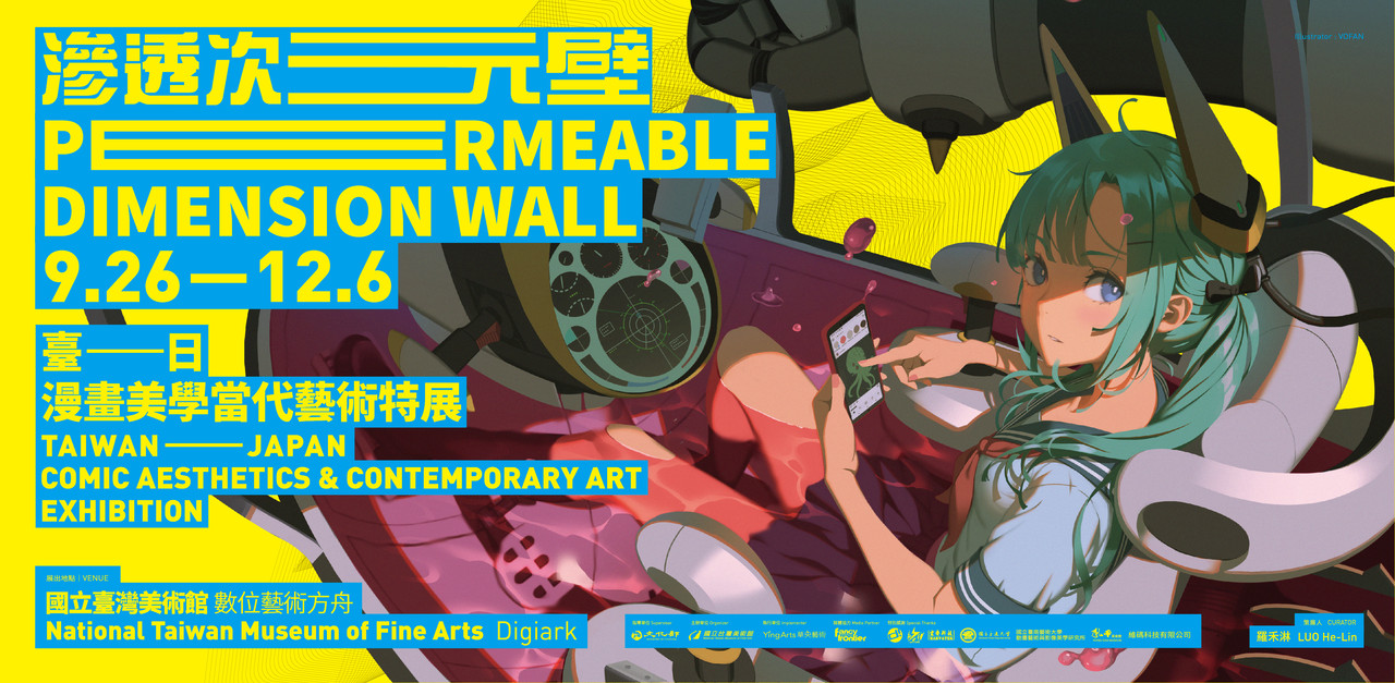 國立台灣美術館於26日起展出「滲透次元壁—臺日漫畫美學當代藝術特展」。今天(25日)在台北台灣漫畫基地舉行記者會,邀請國寶級漫畫大師游龍輝及在日本具知名度的人設插畫家VOFAN致詞,也邀請到角色扮演者夏侯橘助、布雷德及Peter走秀。這次的展覽邀請了包括霹靂國際多媒體在內等28組台灣和11組日本的藝術家或團體參展。
