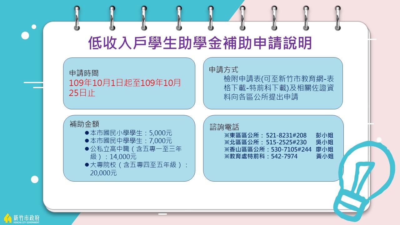 民眾若有任何申請低收入戶學生助學金之相關問題,歡迎來電洽詢市府教育處、三區區公所民政課,聯繫方式如下:東區區公所電話:03-5218231分機208、北區區公所電話:03-5152525分機230、香山區區公所電話:03-5307105分機244、本府教育處特前科電話:03-5427974。