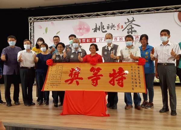 桃園市政府近年來,推出自有品牌紅茶「桃映紅茶」,已廣開知名度,市府農業局為鼓勵茶農精進品質,委託龍潭鄉農會舉辦優質紅茶評鑑比賽,競賽點數逐年增加,今年更高達306點(3060斤),增添比賽可看性。經過激烈廝殺後,由從業30年的龍潭茶農鍾桂香連莊奪冠,抱回特等大獎,26日於市府受獎。