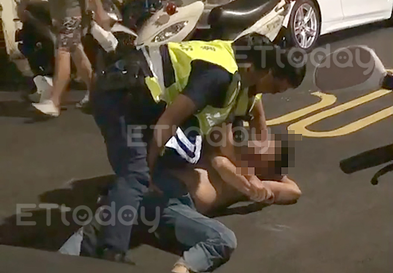 被害少東不敢開門,深恐林男闖進來攻擊家人,無奈只好報警處理,轄區中山警方派員到場維護秩序,林男卻頻頻嗆警「我被打了」,甚至用髒話辱罵警察,警員只好動用強制力將林男壓制,過程林男還與警方扭打倒地,所幸警方增援並噴辣椒水,順利制伏林男將他帶回調查。