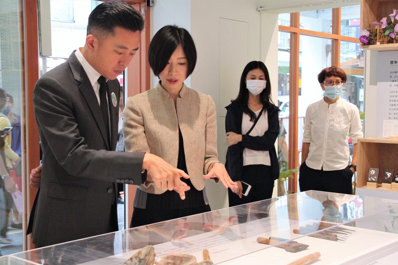 ▲計畫主持人張馨之為新竹市長林智堅講解蓪草工藝工序。(圖/新竹市文化局提供)