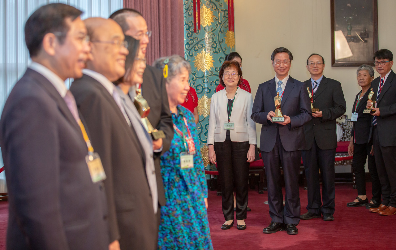 接著,蔡英文提到一位今天沒有辦法出席的得獎者,正是新竹縣竹北國小蔡宛芯老師,「她3個月前在布置畢業典禮會場,不慎因公殉職。她教書20餘年,不斷用創新的教育方式為學生帶來新的啟發。」