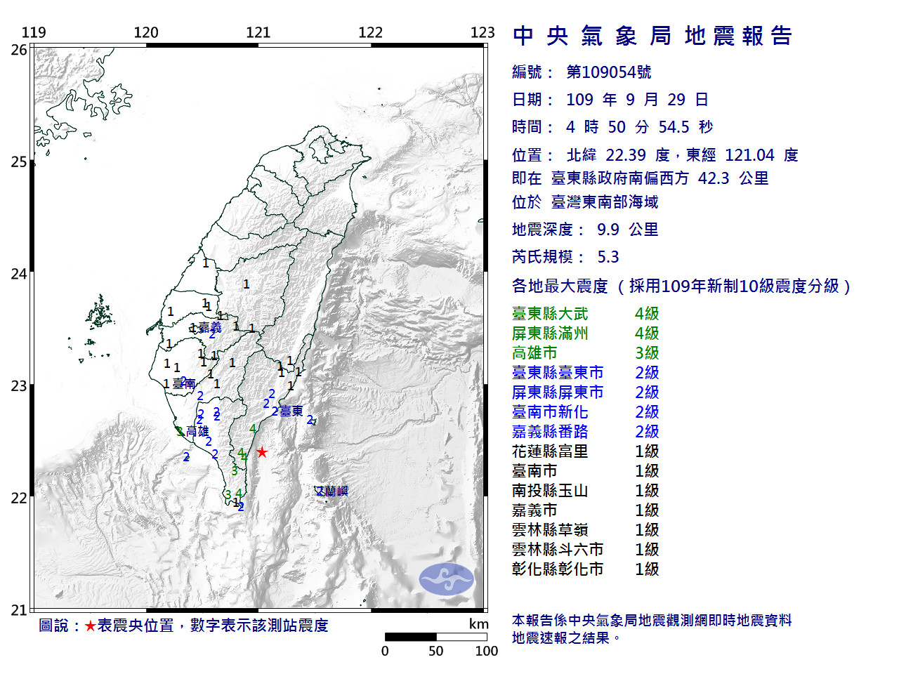 根據中央氣象局報告指出,稍早在3點5分時在台東外海也發生一起規模4.4的有感地震,台東大武最大震度4級,屏東最大震度3級,高雄台南也有感。