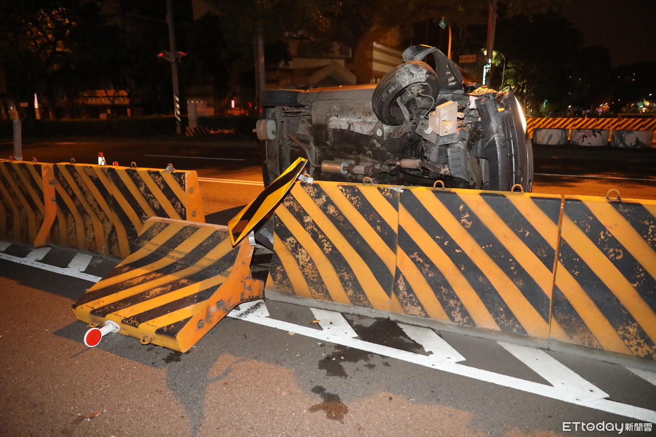 ▲台中市29日清晨一名男子酒駕,車子失控撞倒護欄後翻車意外。(圖/民眾提供)