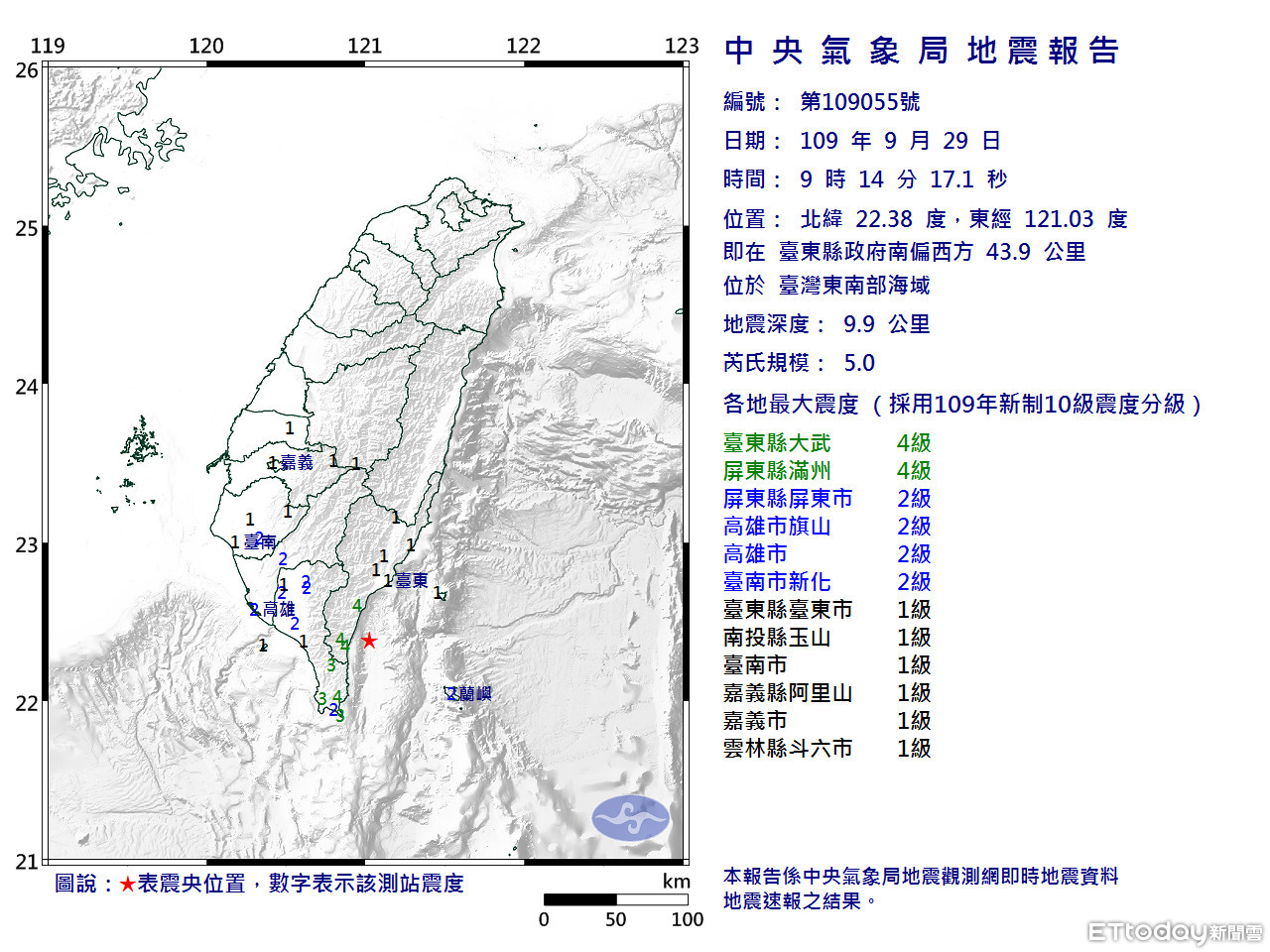 台東外海6小時連7震!根據中央氣象局的地震報告,今天(29日)上午9時14分發生芮氏規模5.0的有感地震,震央位於東南部海域,地震深度9.9公里,台東縣、屏東縣最大震度4級。