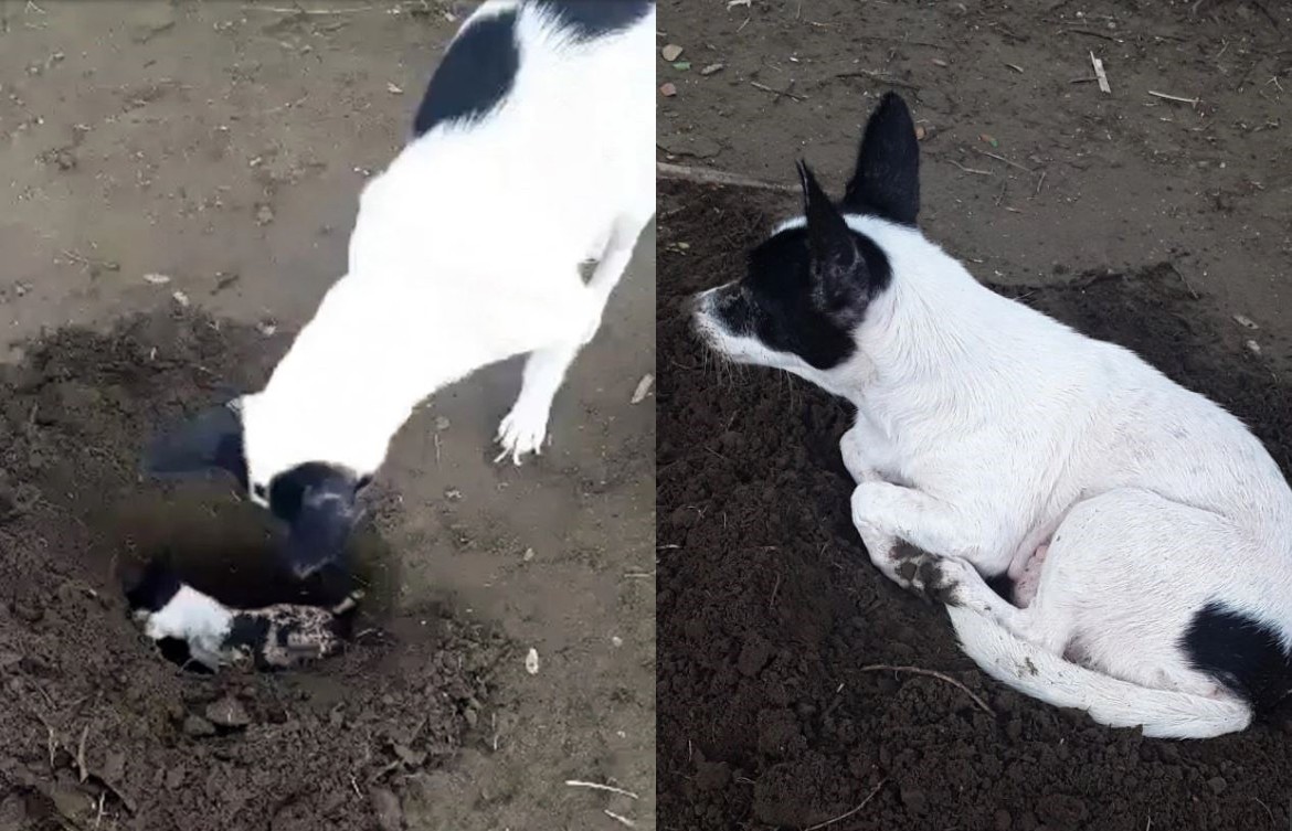 愛麗瑪表示,「我試著把狗寶寶帶走,但她不讓我這麼做,所以我就把牠們留在那裡,直到貝蒂準備好埋葬牠。」貝蒂將已經喪生的小狗狗扔進洞裡,再用泥土覆蓋,就像是在為牠下葬一樣,然後躺在寶寶的墳墓上好幾個小時。