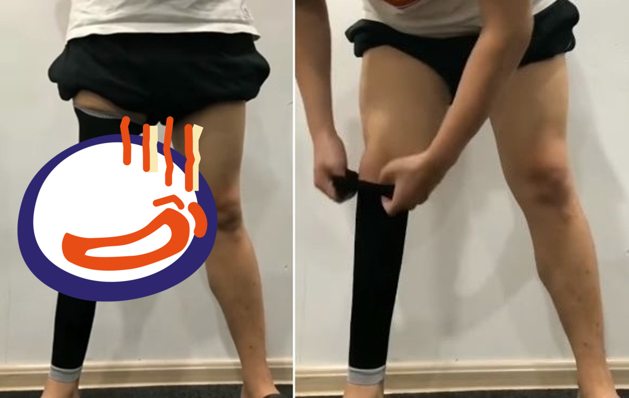 原PO在臉書社團「爆廢公社二館」貼出照片,廣告中的模特原本大腿粗壯,小腿也有頑固的蘿蔔,但右腿一套上瘦腿襪瞬間小了3號,變成大小腿粗度相同的鉛筆腿,甚至連膝蓋都變小了,又直又長超顯瘦,廣告詞還打著「我的肌肉大腿有救了!」看起來相當吸引人。