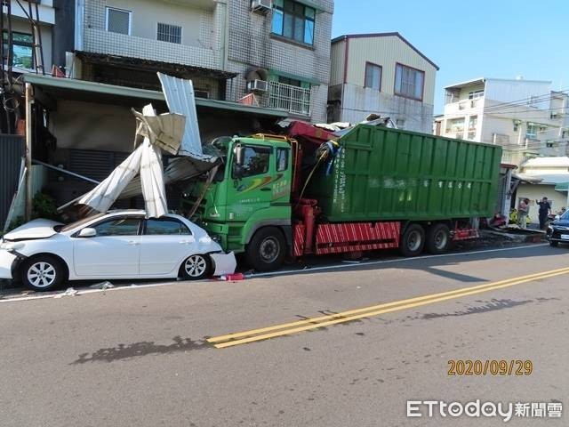 ▲潘姓男子駕駛聯結車疑疲勞駕駛,失控連撞3間民宅鐵皮遮雨棚及停在路旁自小客車及機車。(圖/記者林悅翻攝,下同)