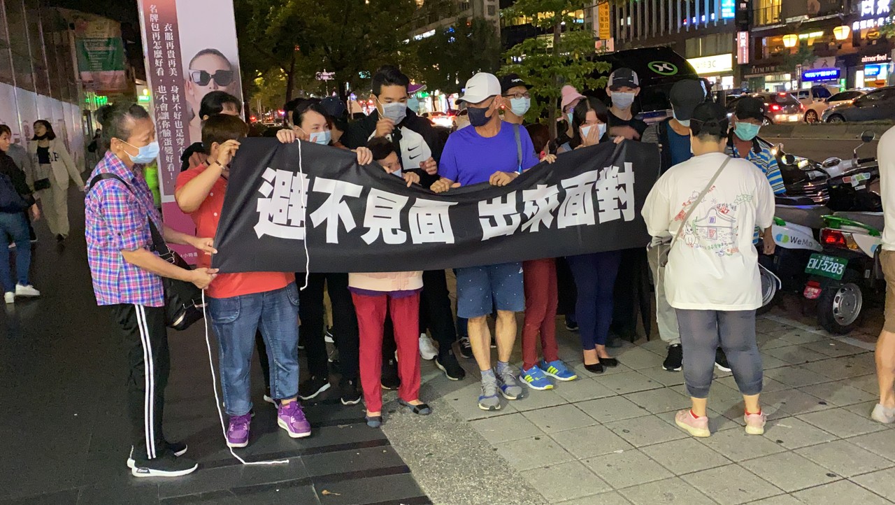 ▲酒店女大亨為抗議女婿疑似侵吞酒店經營權,晚間到東區街頭拉布條抗議。(圖/記者游宗樺翻攝)